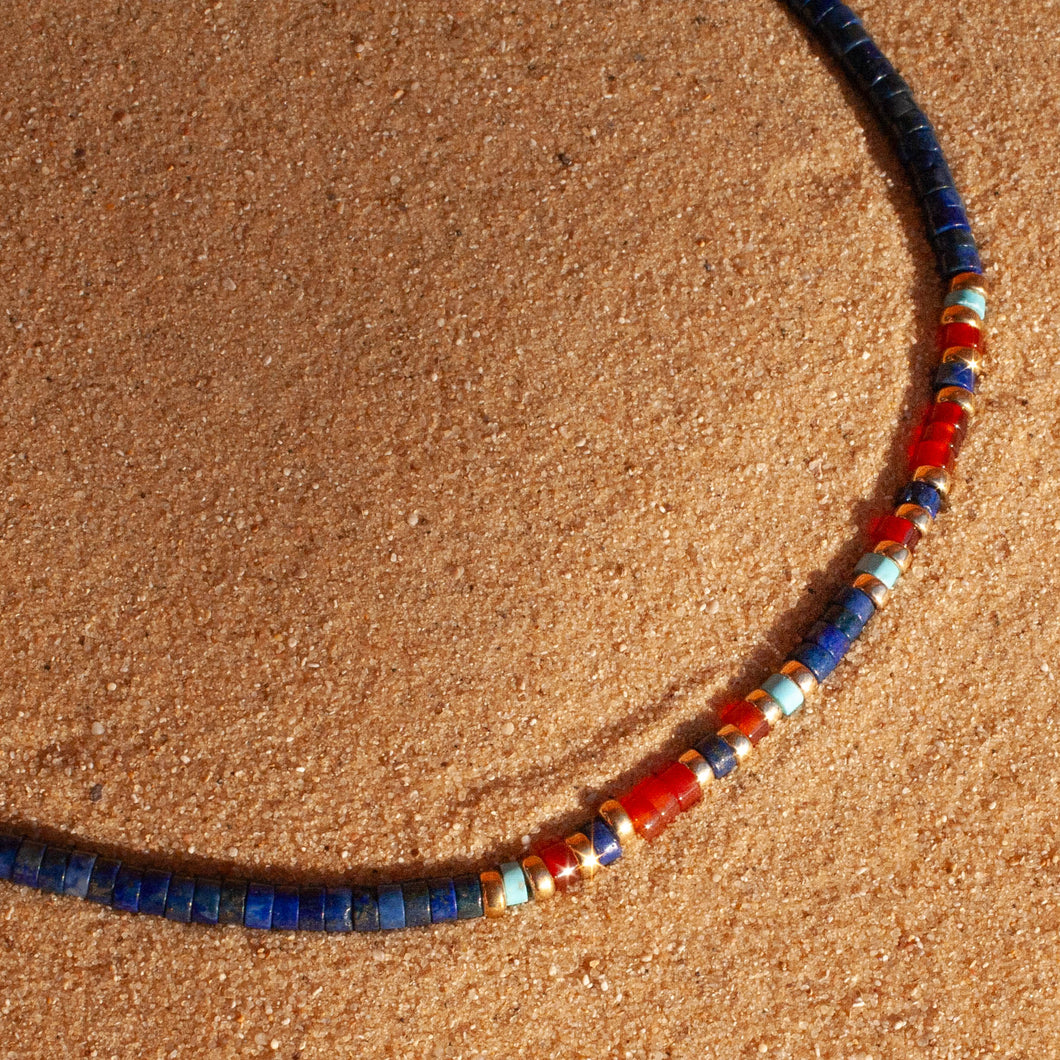 The necklace features genuine turquoise from U.S., Carnelian from India and Lapis Lazuli from Afghanistan as well as 14ct gold filled beads and clasp. Gold filled is thicker and more durable than gold plated."